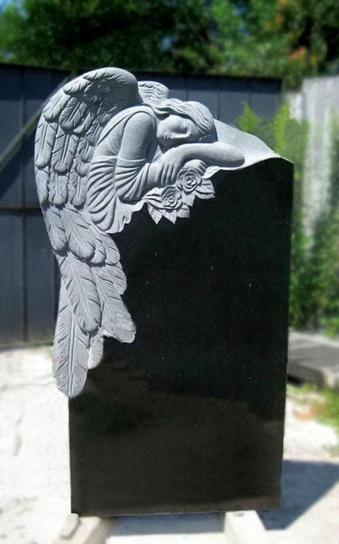 Памятник из черного гранита с фигурой скорбящего ангела со цветами - можно заказать в нашей мастерской в Санкт-Петербурге по приемлимым ценам.
