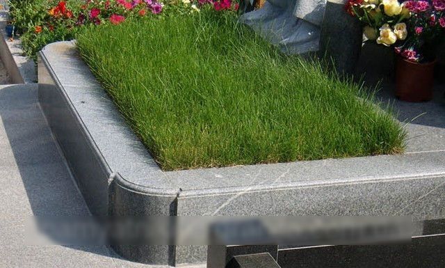 Открытый цветник из серого гранита с газоном.